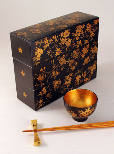 和紙肌内金箔子持ち長角三段重箱「しだれ桜」